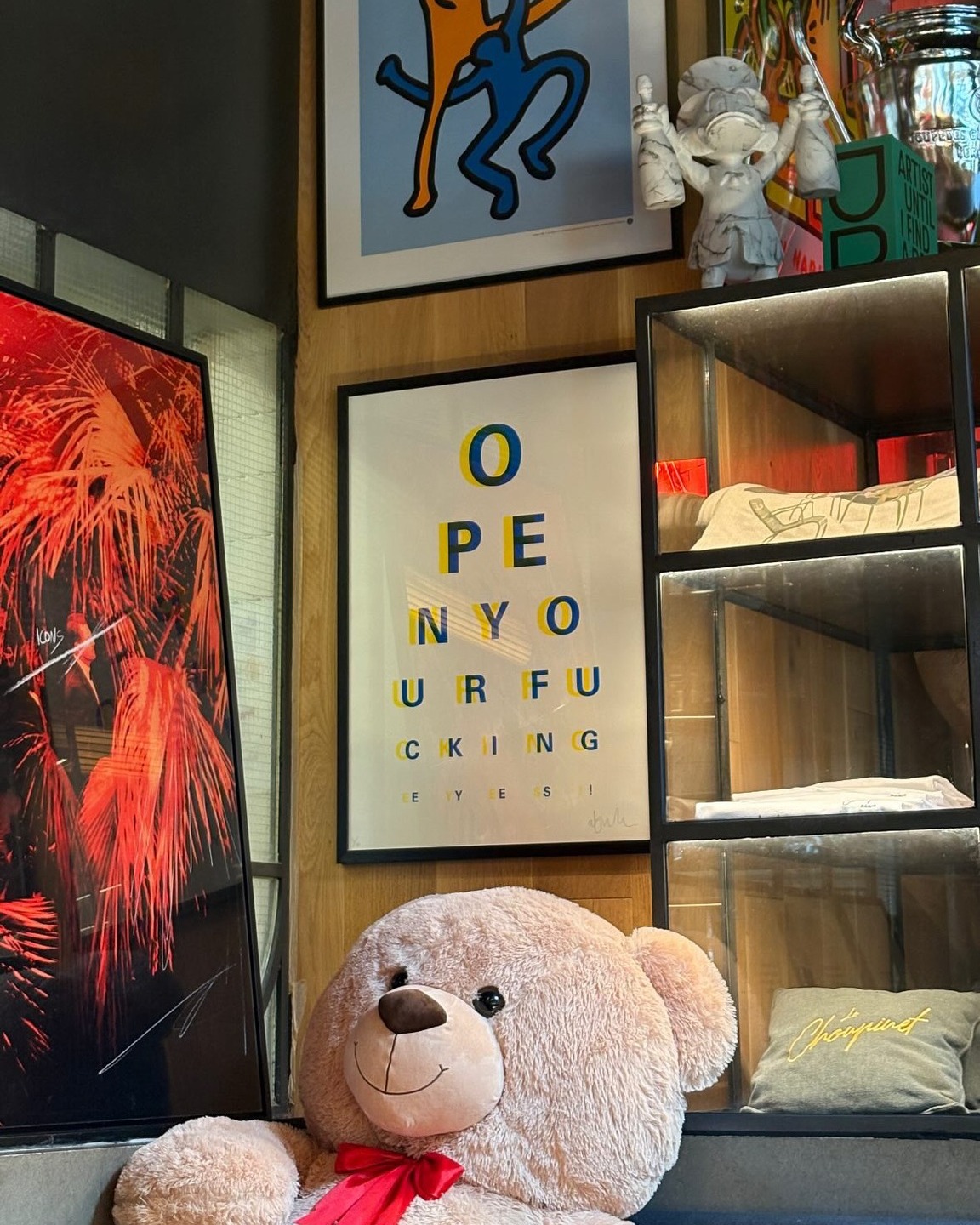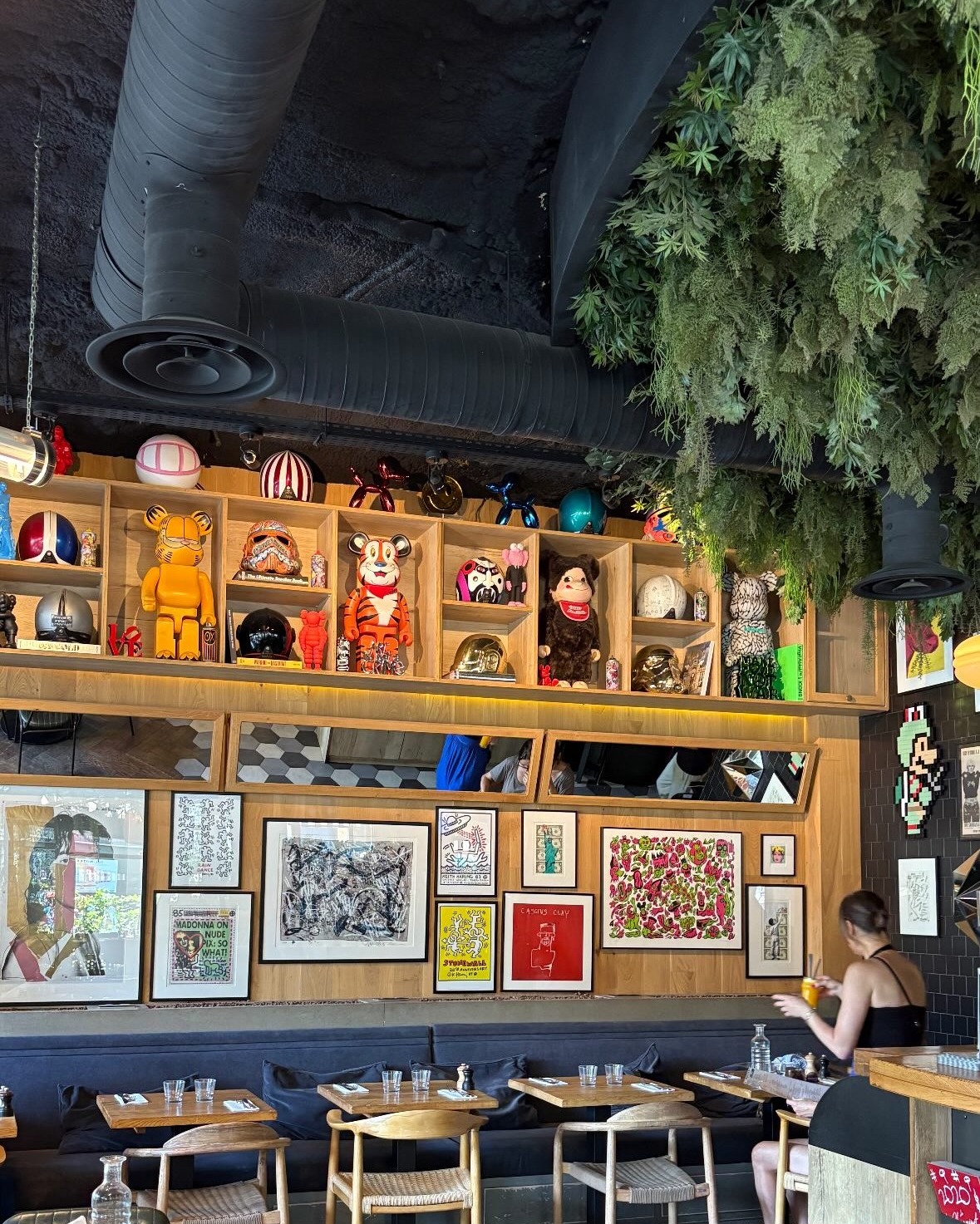 Le décor du Choupinet est pensé pour surprendre et stimuler les sens. Les œuvres contemporaines d’Alec Monopoly, le plafond végétalisé, le mobilier en cannage et les objets vintage cohabitent avec des éléments plus inattendus, comme les figurines Bearbrick et les peluches géantes. Chaque table offre une vue différente, invitant à explorer le lieu, à remarquer un détail ou à sourire devant une touche humoristique. Cette attention portée aux visuels contribue à rendre l’expérience plus mémorable et à prolonger la magie après le repas.