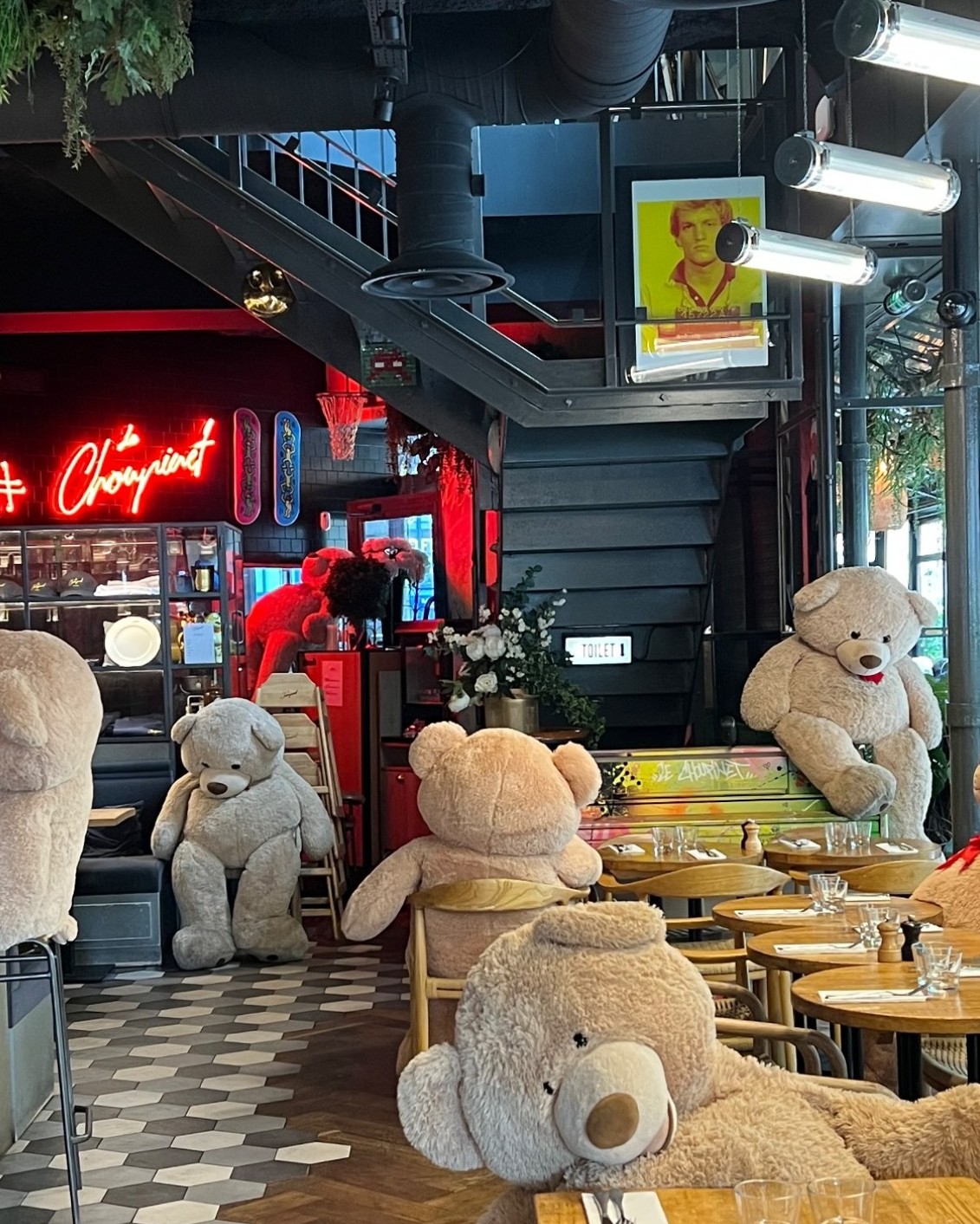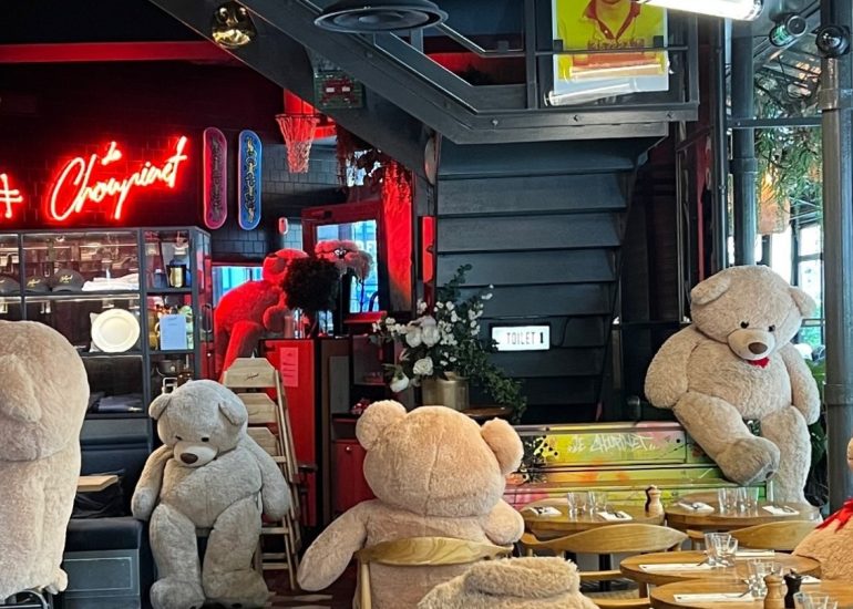 Dès que l’on pousse la porte du Choupinet, l’atmosphère vous enveloppe. Les odeurs de cuisson, le cliquetis de la vaisselle, le murmure des conversations et les rires des enfants se mêlent pour créer un véritable cocon vivant. Les peluches géantes, disséminées dans le restaurant, ajoutent une touche ludique et régressive qui surprend et séduit autant les adultes que les plus jeunes. L’immersion ne se limite pas à la gastronomie : chaque détail, du mobilier au moindre objet décoratif, contribue à raconter une histoire.
